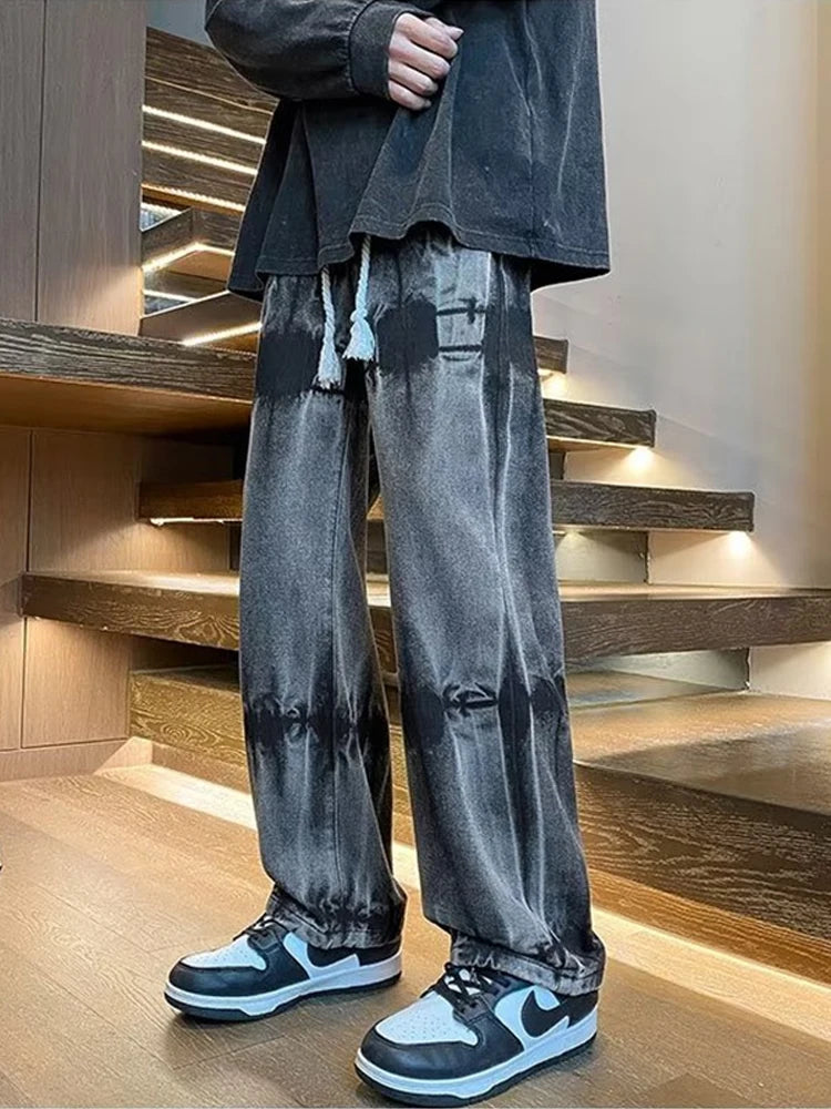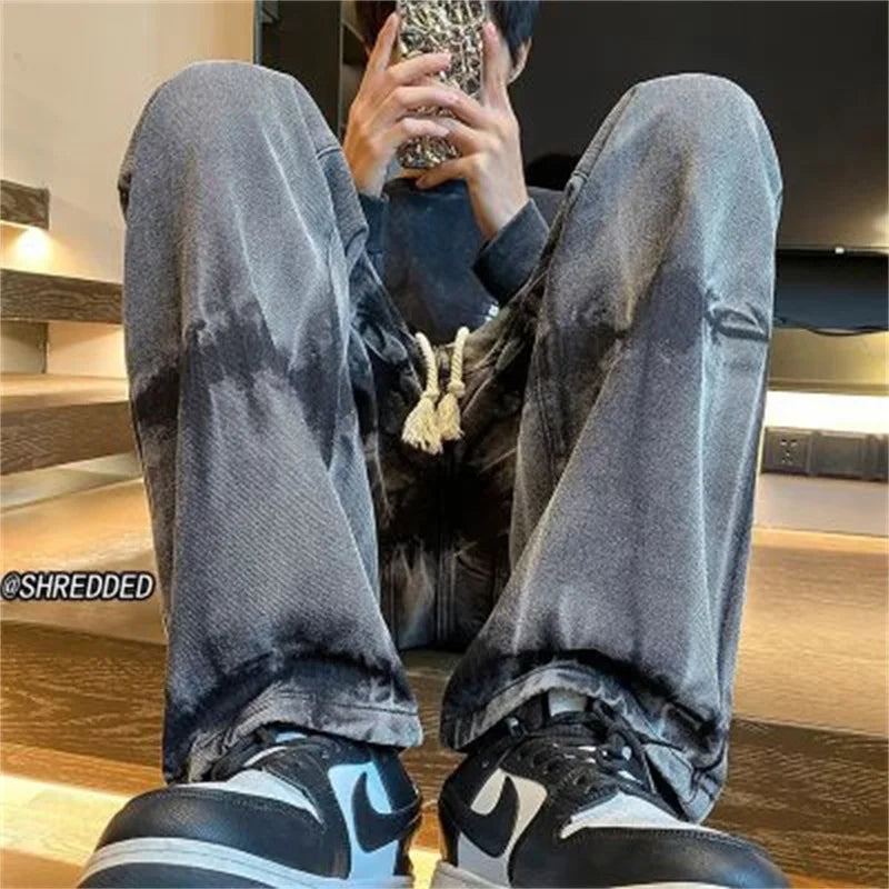 2026 New Tie Dye Retro Drawstring Jeans For Men Baggy High Street Straight Pants Hip Hop Fashion Casual y2k jean hombre pantalon